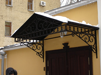 Козырек из листа металла с элементами ковки. Цена указана за козырек размером 1*1м с полимерным покрытием, рама козырька выполнена из трубы профильной 20*20мм, кованые элементы из квадрата 10мм, зашит листом металла толщиной 2мм. Стоимость козырька другого размера, монтажа и доставки уточняйте отдельно у менеджеров компании.