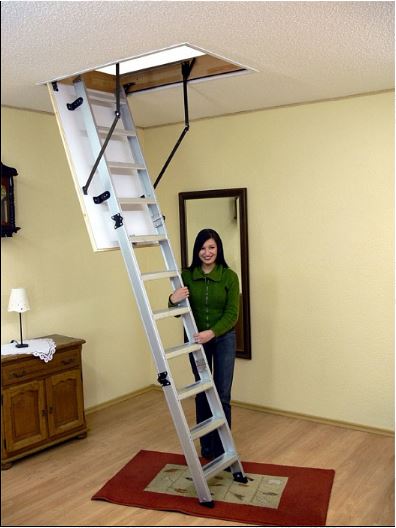 Лестница складная трехсекционная. Рабочая поверхность полностью выполнена из алюминия. Термоизоляционная крышка типа "сэндвич" толщиной 47 мм, имеет усиленную теплозащиту, облицована с двух сторон ДВП белого цвета. По контуру короба имеется уплотнитель. Все металлические элементы лестницы покрыты порошковой краской.