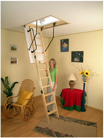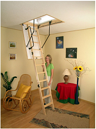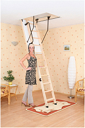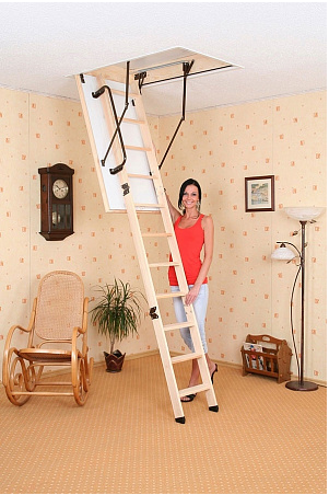 Чердачная лестница складная четырехсекционная, изготовлена из сосны. Термоизоляционная крышка типа "сэндвич" толщиной 46 мм, имеет усиленную теплозащиту, облицована с двух сторон ДВП белого цвета. По контору короба имеется уплотнитель, высота короба 170 мм. Все металлические элементы лестницы покрыты порошковой краской, ступени лестницы имеют антискользящие насечки и закреплены в столярное соединение «ласточкин хвост», что позволяет выдерживать нагрузку 150 кг.