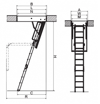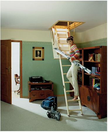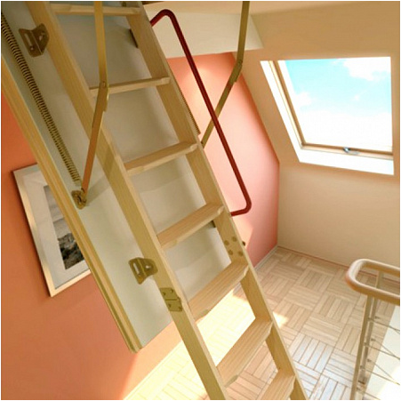 Данную модель лестницы можно использовать даже в домах, где значительна разница температур между этажами, и тем самым ограничить проникновение холода в жилые помещения. Лестница состоит из трех секций, которые компактно складываются и «хранятся в потолке». Крышка люка облицована ДВП белого цвета, что делает ее практически незаметной при установке в светлом или белом потолке. Для большего удобства и безопасности эксплуатации лестница Thermo оснащена боковым металлическим поручнем, а пластиковые наконечники предохраняют поверхность пола от повреждения и увеличивают устойчивость конструкции