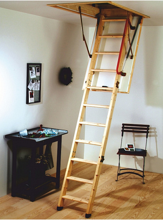 В комплекте: люк из сэндвич-панели, пружинный механизм "короб-люк", короб, трехсекционная лестница с буковыми ступенями, замок люка, штанга для раскладывания лестницы