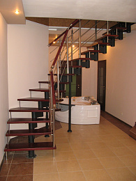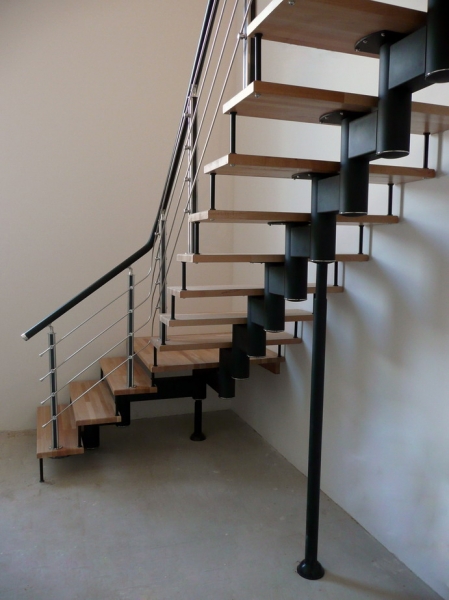 Преимущество данной лестницы в ее универсальности (собрать и установить лестницу можно самостоятельно), также данную лестницу отличает невысокая стоимость и быстрый срок изготовления. В комплекте к лестнице идут деревянные ступени из массива сосны, березы, бука, ясеня или дуба. Данные лестницы хорошо сочетаются с ограждениями из нержавеющей стали.