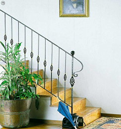 Кованое ограждение для лестницы с декоративными корзинками.Ограждение из обжатого металлического прутка.