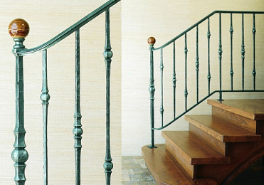 Перила лестничные, состоящие из кованых балясин с литыми вставками. Данные перила послужат не только надежной ограждающей конструкцией для вашей лестницы, но и придаст ей уникальность и привнесет изюминку в интерьер вашего дома. Наша компания готова предложить вам разнообразные перила и ограждения для лестниц собственного производства и производства известных мировых производителей.