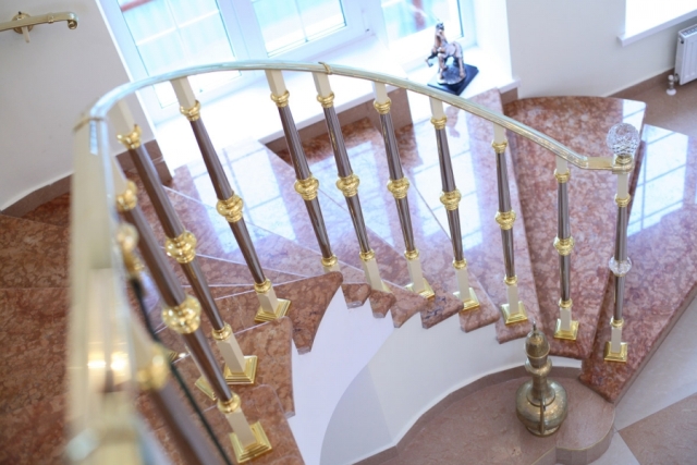Ограждение для лестницы с балясинами из нержавеющей стали и латунными вставками. Стоимость на данное ограждение для лестниц вы можете уточнить у менеджеров отдела продаж.