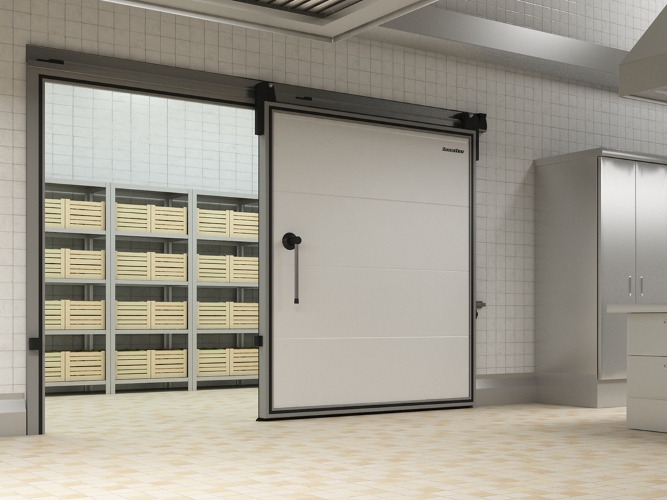 Среднетемпературные и низкотемпературные откатные двери IsoDoor IDS1 предназначены для организации входных групп холодильных и морозильных камер складов, терминалов, логистических центров, предприятий пищевой промышленности и торговли с большим трафиком механизированных погрузочных средств.