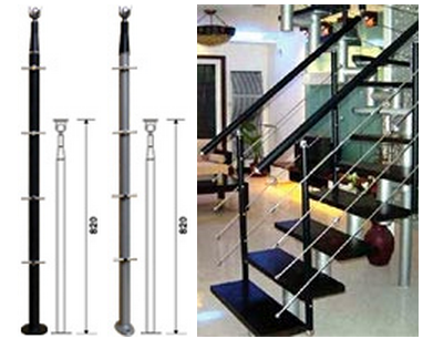 Стойка поставляется в разобранном виде. Два места: стойка и пакет с фурнитурой. Шурупы для крепления стойки и поручня в комплект не входят. Коромысло для крепления поручня имеет поворотный шарнир. Стойки предназначены под поручень диаметром 50 мм. Спицедержатели для спиц диаметром 8 мм. Стойки на лестничных маршах устанавливаются через одну – две ступени, так что бы расстояние между ними было не более 70 см. В противном случае прочность ограждения снижается и вероятно провисание спиц. Расстояние в 50 – 70 см между стойками следует соблюдать и при сборке ограждения проемов и балюстрад.
