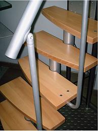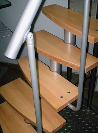 Ступени и поручень выполнены из массива ольхи, покрыты лаком. Металлический каркас пластифицирован.