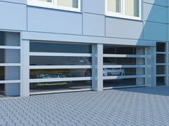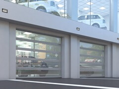 Панорамные секционные ворота серии ISD02 полностью или частично состоят из панорамных панелей, благодаря чему являются идеальным вариантом для установки в зданиях с остекленными фасадами, например, в автомобильных салонах. Они не уступают по прочности промышленным секционным воротам серии ISD01 благодаря тому, что панорамные панели изготавливаются из прочных алюминиевых профилей.