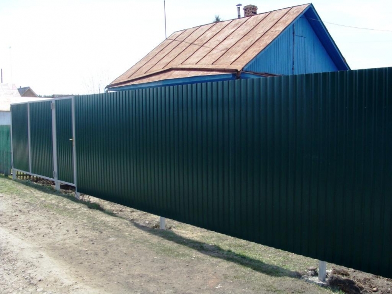 Высота 1800мм. Забор из профнастила марки С8. Столбы бетонируются на 800-1000мм в грунт и располагаются через 2500-3000мм друг от друга.
